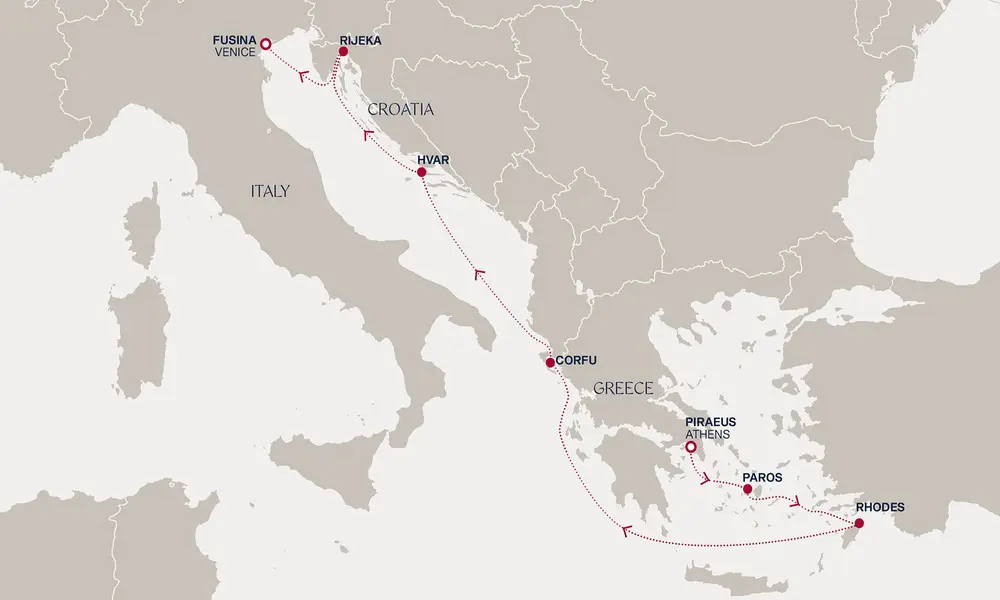 Od antičkih hramova Atine do peščanih plaža i šarmantnih sela Parosa, svaka stanica nudi novu priču. Rodos vraća u vreme vitezova i mitova, Krf očarava maslinjacima, a Hvar miriše na lavandu. Rijeka otkriva raskoš arhitekture, dok romantični kanali Venecije pružaju savršenu završnicu.