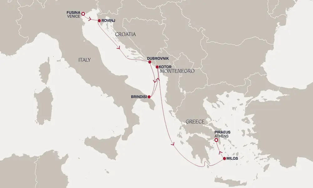 Od venecijanskih kanala do slikovitog Rovinja, svaka luka priča svoju priču. Dubrovnik zadivljuje srednjovekovnim zidinama, Brindizi spaja rimsku istoriju i morski šarm, a Kotor otkriva bajkoviti zaliv. Nakon dana potpunog odmora na moru, stižemo na Milos, pre nego što nas Atina dočeka svojom kombinacijom urbanog života i antičkih čuda.