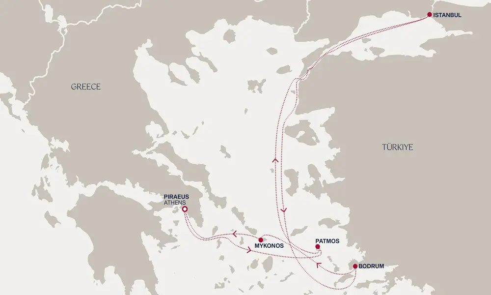Atina, grad bogova i filozofa, uvodi nas u priču gde se mit i stvarnost prepliću. Patmos vodi do svetih visina, Istanbul osvaja minaretima i šarenilom ulica, a Bodrum nudi spoj antičkih tragova i tirkiznog mora. Mykonos donosi miris Egeja i ritam obalskih taverni, pre povratka u Atinu.